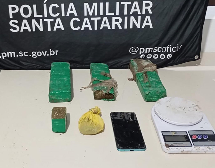 No total, foram apreendidos 1,54 kg de maconha, além de uma balança de precisão e celulares. Os suspeitos, de 27 e 34 anos, foram conduzidos à Central de Flagrantes de Tubarão.