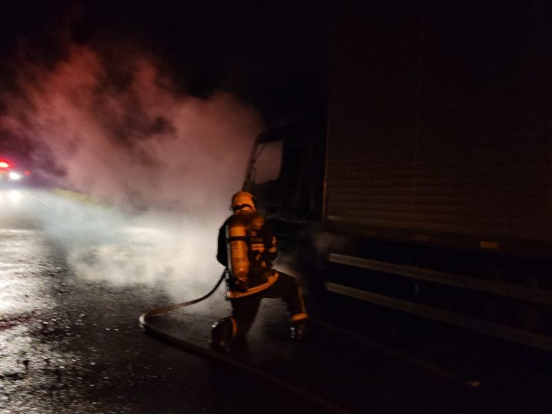 Quando o Corpo de Bombeiros chegou ao local, por volta das 20h10, a cabine já estava toda em chamas. Foram gastos 3,5 mil litros de água para o combate do fogo e para salvar a carroceria do tipo baú.