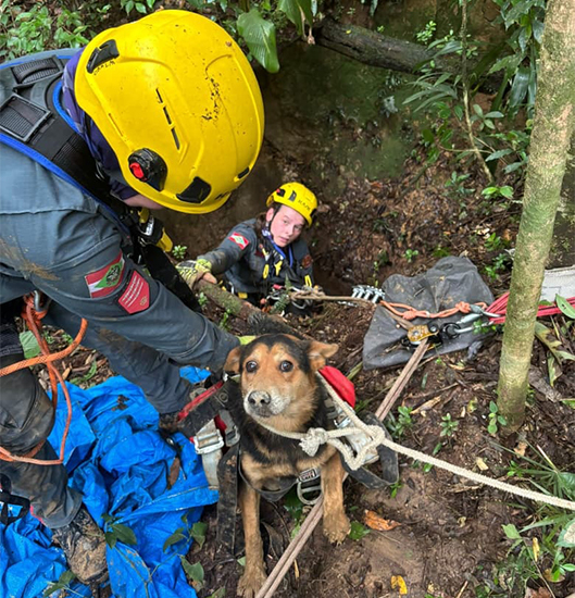 No local, os socorristas constataram que um cachorro estava dentro de uma antiga galeria pertencente a uma mineradora da região. O acesso ao interior do buraco só foi possível com a utilização de técnicas de salvamento em altura.