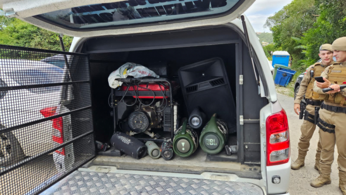 Na tarde deste domingo (29), policiais militares de Imbituba apreenderam caixas de som na faixa de areia da Praia do Rosa Norte, no bairro Ibiraquera.
