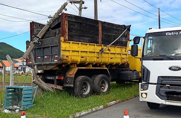 Foto: Luiz Vieira/DS Um caminhão caçamba colidiu contra um poste na entrada do bairro Village, em Garopaba, durante a madrugada de ontem. Segundo informações, o veículo desceu sem freio e acabou atingindo a estrutura próximo à sede da Associação de Moradores da comunidade.