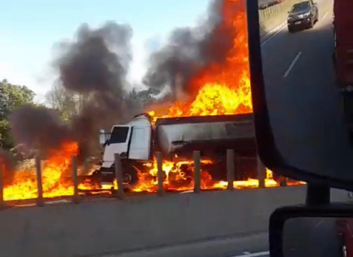 Um acidente envolvendo um caminhão que transportava combustível deixou a BR-101, em Imbituba, totalmente bloqueada após o veículo pegar fogo, na manhã desta segunda-feira (12).