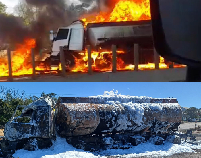 Um acidente envolvendo um caminhão-tanque carregado com 25 mil litros de gasolina deixou a BR-101, em Imbituba, totalmente bloqueada após o veículo pegar fogo, ontem pela manhã. Segundo a Polícia Rodoviária Federal, o incêndio teve início após uma carreta, com farelo de milho, colidir na traseira do caminhão por volta das 11h.