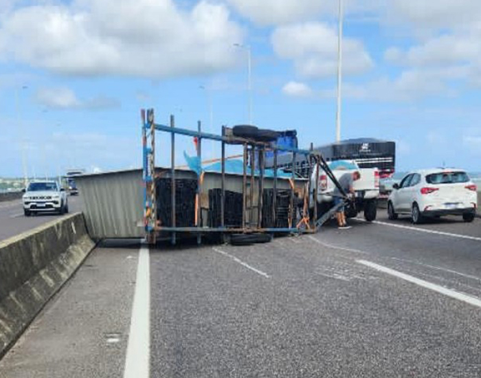 Um caminhão reboque, levando uma piscina, tombou na tarde desta quinta-feira na ponte Anita Garibaldi, em Laguna. O acidente foi registrado por volta das 16h, no sentido norte da rodovia.