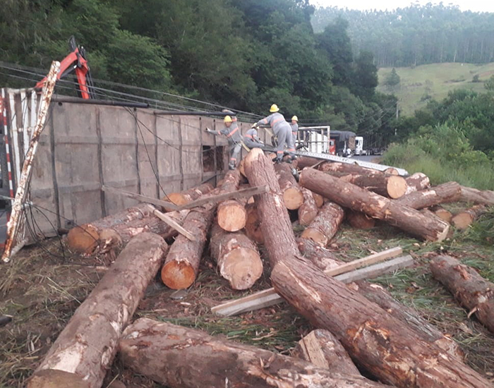 Um caminhão carregado com toras de madeira tombou e atingiu um poste de energia na SC-435, entre Armazém e São Martinho, ontem pela manhã. No veículo, estavam um casal com um bebê.