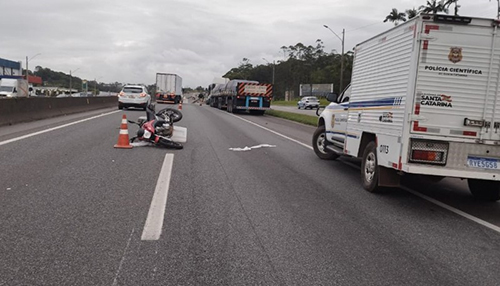 Um caminhão com placas de Capivari de Baixo se envolveu em um acidente com óbito na BR-101, em Joinville. Segundo a Polícia Rodoviária Federal (PRF), um motociclista de 19 anos morreu após colidir lateralmente em uma carreta não identificada, cair e ser atropelado pelo caminhão. O incidente ocorreu no km 36,1 da rodovia.