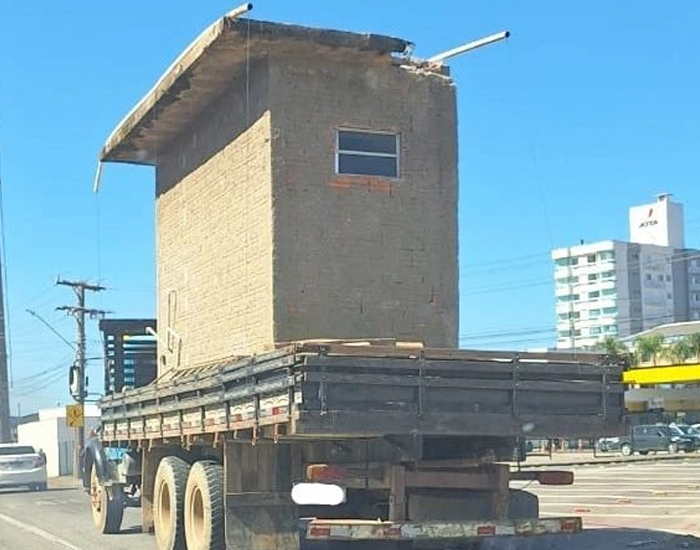 Um flagrante registrado na marginal da BR-101, em Tubarão, viralizou nas redes sociais e chamou a atenção da Polícia Militar Rodoviária. As fotos são de um caminhão levando um banheiro de alvenaria na carga.