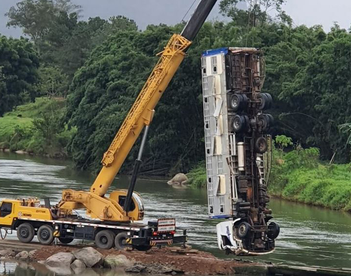 Foi retirado ontem, de um rio de Braço do Norte, o caminhão que caiu de uma ponte no dia 28 de maio e estava submerso. O condutor, que é de Mondaí, no Oeste catarinense, disse que perdeu o controle do veículo ao fazer uma entrega na região.