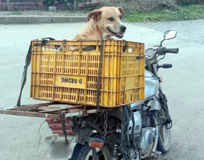 Um cachorro foi flagrado sendo transportado em uma caixa de feira improvisada na garupa de motocicleta em São Bento do Sul, no norte de Santa Catarina. O veículo estava com licenciamento atrasado e o condutor não possuía Carteira Nacional de Habilitação (CNH), segundo a Polícia Militar Rodoviária (PMRv).