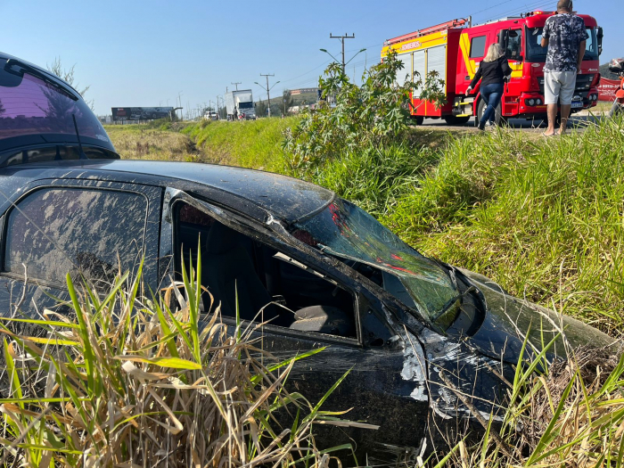 O condutor do Chevrolet Celta foi encontrado pelos bombeiros no interior do veículo e consciente.