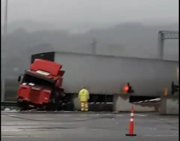 Uma carreta colidiu contra uma barreira de concreto da praça de pedágio na BR-101, em Tubarão, na manhã dessa quinta-feira.