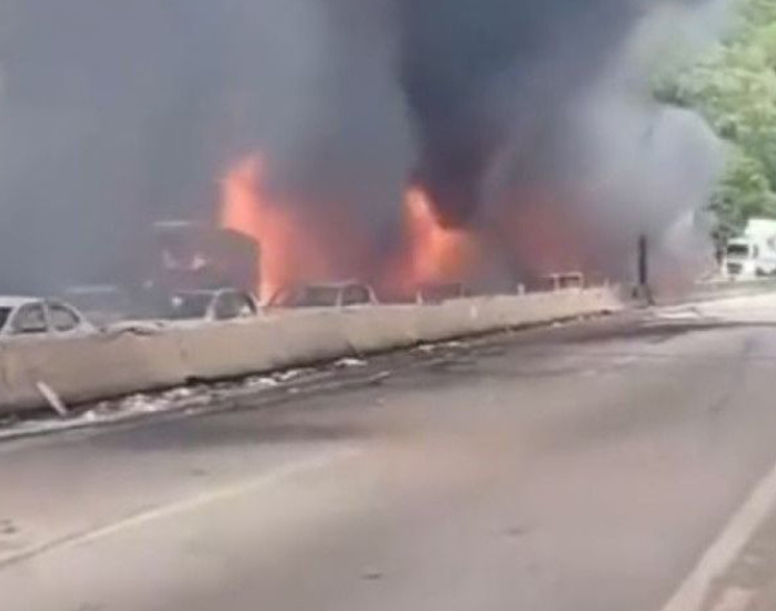 Caminhão-tanque tombou e fogo deixou cinco feridos e queimou 25 veículos.