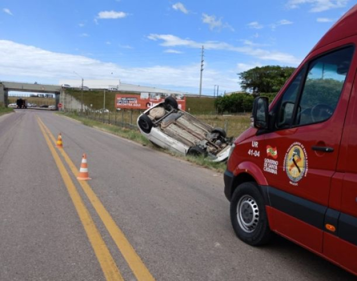 Um veículo VW Gol capotou na tarde de sexta-feira no bairro Costa da Lagoa, em Jaguaruna. O acidente aconteceu na rodovia SC-441, estrada que liga ao município de Treze de Maio.
