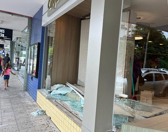 O carro subiu na calçada e atingiu a fachada da loja City Blue. No momento do acidente, a loja estava fechada.