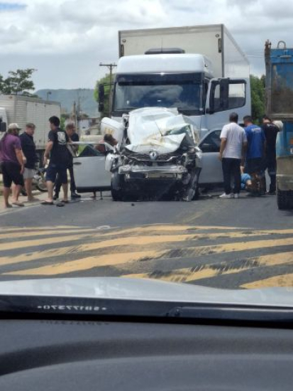 Um acidente de trânsito do tipo engavetamento mobilizou equipes de resgate na tarde desta quinta-feira (22) na SC-370, na localidade de Termas, no município de Gravatal. A ocorrência envolveu um caminhão Mercedes-Benz e um veículo Renault Kangoo e foi atendida pelo Corpo de Bombeiros Militar de Santa Catarina (CBMSC).