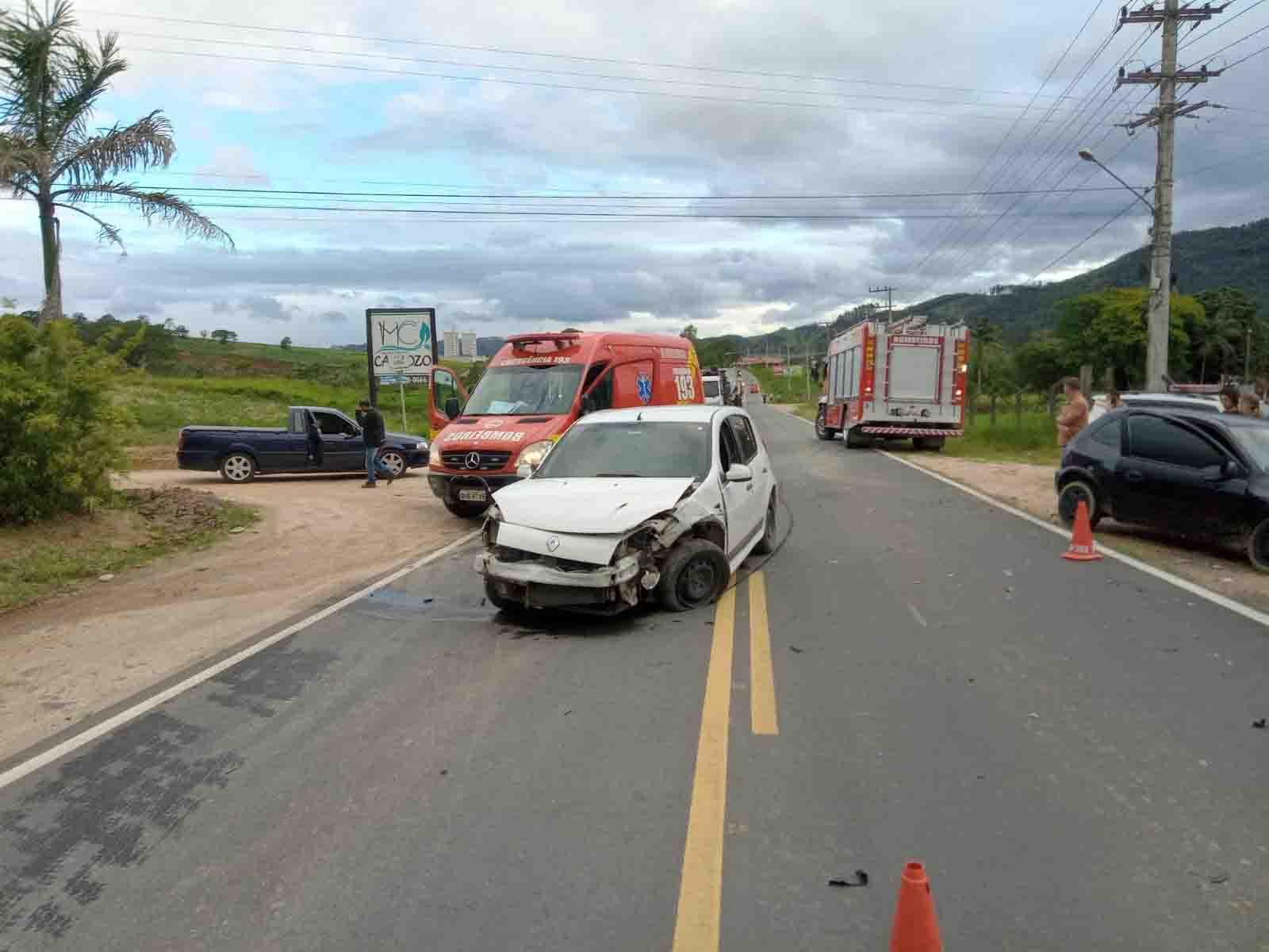 Três pessoas ficaram feridas após uma colisão frontal envolvendo um Celta e um Sandero ontem, na SC-108, em Braço do Norte.