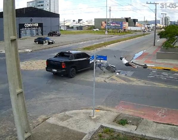 Um motociclista foi arremessado após uma colisão com uma caminhonete ontem, na rótula da Avenida Pedro Zapelini com a Rua Teodoto Tonon, em Tubarão.