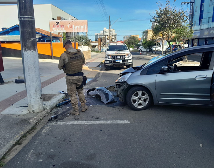 O impacto danificou a parte dianteira do veículo e o poste, chamando a atenção de pedestres e motoristas que passavam pelo local.