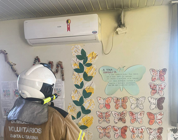Um princípio de incêndio em um ar-condicionado de uma escola mobilizou os Bombeiros Voluntários na tarde de ontem, em Sangão. No momento do incidente, as crianças que estavam na sala foram retiradas às pressas pelos professores. Ninguém ficou ferido, informou a guarnição.