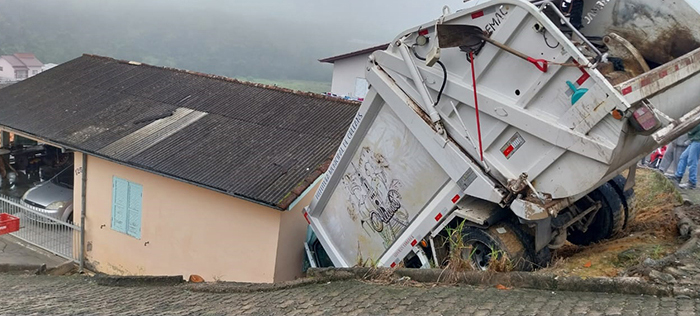 Foto: EA Notícias/DS Um grave acidente envolvendo um caminhão da coleta de lixo da prefeitura de Orleans foi registrado ontem pela manhã. O veículo perdeu o controle em uma via molhada pela chuva e colidiu contra a parede de uma residência na Rua Bahia, no bairro Bussolo.