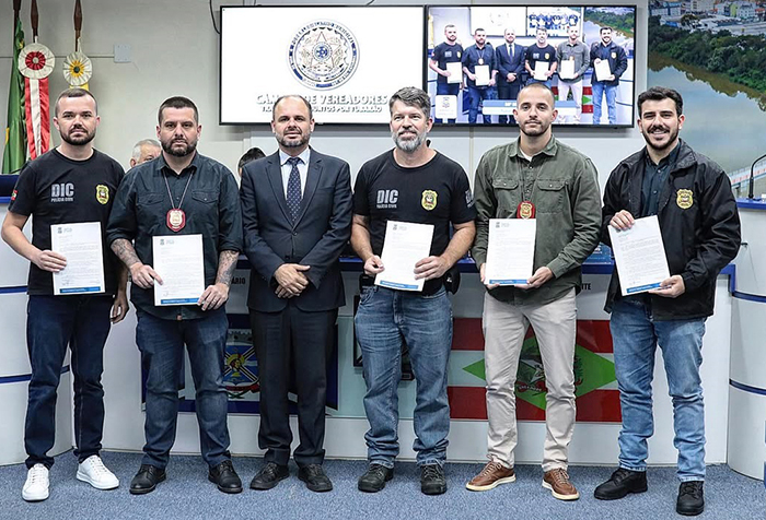 A Delegacia de Investigações Criminais (DIC) de Tubarão recebeu, nesta segunda-feira (20), uma moção de cumprimentos da Câmara Municipal, em reconhecimento ao trabalho de excelência prestado à segurança pública. A homenagem foi proposta pelo vereador Felippe Tessmann e aprovada pelos demais parlamentares.
