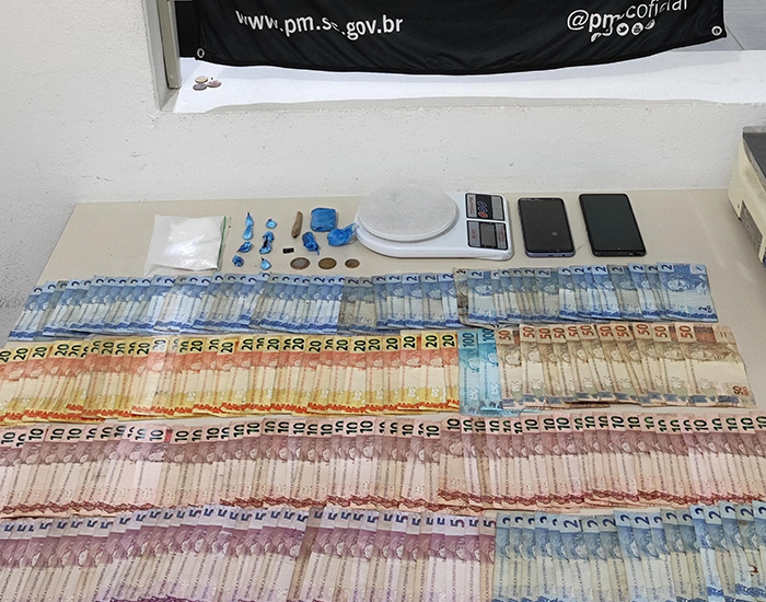 No local, a guarnição apreendeu porções de maconha e cocaína, balança de precisão, dois celulares e mais de R$ 2,4 mil em notas diversas.