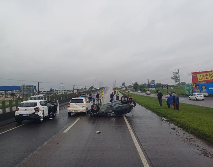 Um engavetamento seguido de capotamento, envolvendo seis carros e uma van, mobilizou a PRF e os bombeiros ontem à tarde na BR-101, em Araranguá.