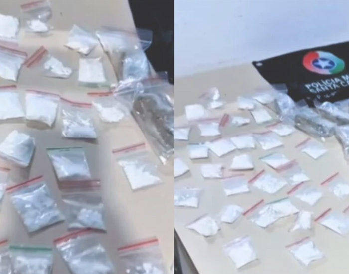 Com autorização, os agentes realizaram buscas no imóvel, onde localizaram mais de 700 gramas de maconha e cerca de 111 gramas de cocaína, já fracionadas e prontas para comercialização. Também foram apreendidos R$ 890 em dinheiro, além da motocicleta utilizada no esquema de entregas.