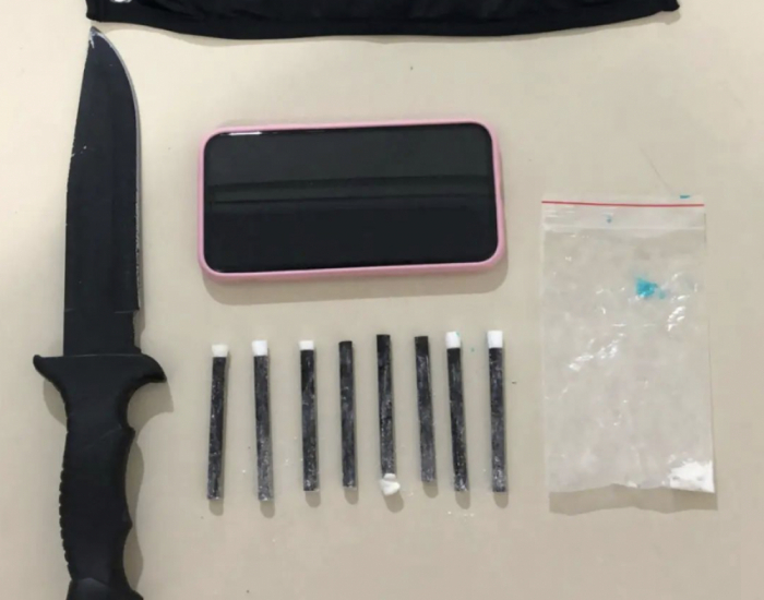 Durante a revista, foi encontrado com o homem uma faca em sua cintura e, na mesa onde estava o casal, uma carteira de cigarros com oito porções de cocaína prontas para a venda.