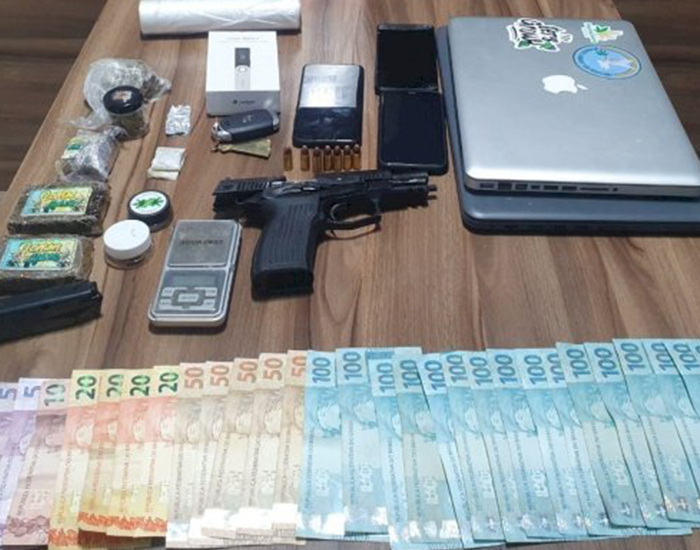 No local, ao todo, foram localizados e apreendidos 37,9 gramas de maconha, 288,7 gramas de haxixe, três aparelhos celulares, uma pistola calibre 9 mm, uma balança de precisão, R$ 2 mil em dinheiro e um automóvel.