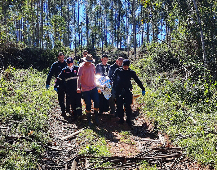 Ele sofreu fratura de fêmur. Devido ao difícil acesso ao local, a equipe do Samu acionou o Serviço Aeromédico. O paciente foi estabilizado e transportado de helicóptero para o Hospital Nossa Senhora da Conceição, em Tubarão, referência em trauma na região.