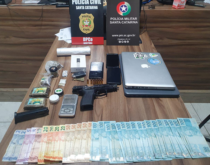 Além disso, os policiais apreenderam um veículo Hyundai Creta, que teria sido adquirido através da venda de drogas ou de lavagem de dinheiro, informou a polícia. O investigado foi conduzido à Delegacia de Polícia de Imbituba, sendo autuado em flagrante pelos crimes de tráfico de drogas e posse ilegal de arma de fogo de uso restrito, com numeração suprimida.