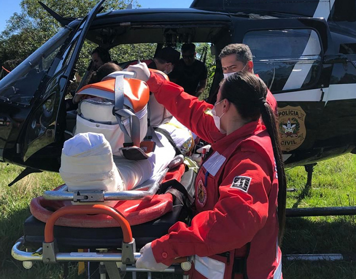 “Prontamente deslocaram o helicóptero para o local do ocorrido, onde a equipe realizou fluidoterapia, medicação e o mesmo foi intubado pelo médico para poder realizar o deslocamento para Tubarão. A equipe avançada do Samu estava esperando e realizou o transporte da vítima até o Hospital Nossa Senhora da Conceição (HNSC)”, informaram os bombeiros.
