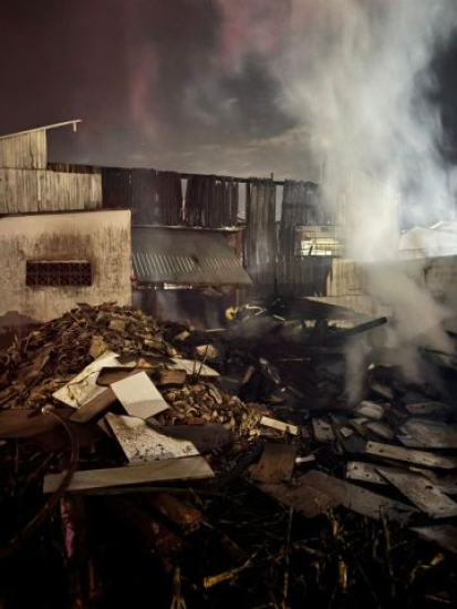 Quando os bombeiros chegaram ao local, por volta das 19h30, o fogo já era visível nos fundos do galpão, atingindo a parede traseira e um empilhado de toras de madeira.