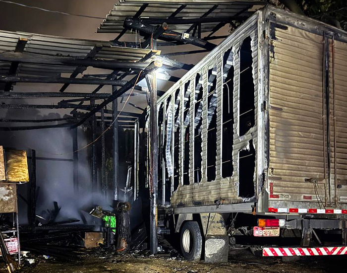 Quando os bombeiros chegaram ao local, a estrutura já estava tomada pelo fogo. A garagem e parte da cocheira foram consumidas pelas chamas. Um caminhão Mercedes, que estava no interior, também foi totalmente destruído.