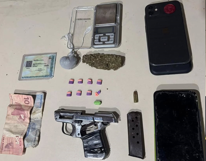 Durante rondas no bairro Nova Brasília, a guarnição avistou o veículo com os dois ocupantes em atitude suspeita. Na abordagem e em revista veicular, foram encontrados e apreendidos uma pistola calibre .22 com a numeração suprimida, uma munição do mesmo calibre, 33 gramas de maconha, nove comprimidos de ecstasy, uma balança de precisão, dois aparelhos celulares e R$ 12 em espécie.