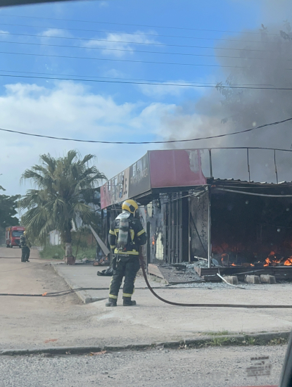 Foto: Tatiana Dornelles Um estabelecimento comercial foi totalmente destruído por um incêndio de grandes proporções em Tubarão. O caso ocorreu na manhã desta segunda-feira, dia 21.