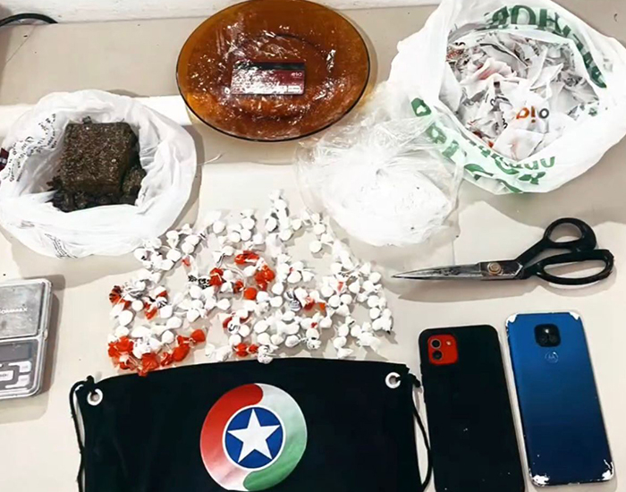 A guarnição foi até o imóvel, constatou o crime e também localizou drogas com a ajuda de um cão farejador. Foram apreendidas 145,4 gramas de maconha, 97,8 gramas de cocaína, balança de precisão e materiais utilizados no preparo dos entorpecentes.
