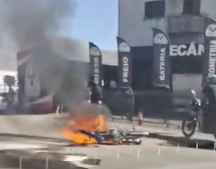 Uma queda de moto na marginal da BR-101, em Tubarão, fez com que o veículo pegasse fogo.