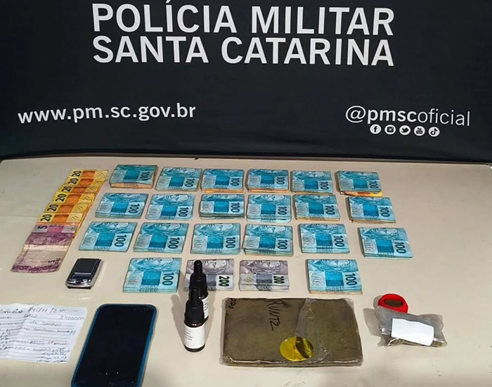 Dentro do veículo, foram encontrados R$ 22.125 em dinheiro, cerca de 248 gramas de haxixe e um telefone celular. Questionado, o homem informou que havia mais entorpecentes em sua residência.