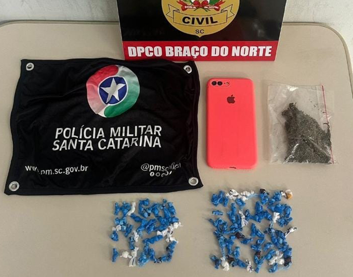 Uma mulher foi presa em flagrante por tráfico de drogas, em Braço do Norte. Na casa dela, os policiais civis e militares apreenderam 104 pedras de crack, devidamente embaladas e prontas para o comércio, um torrão de maconha e um celular.