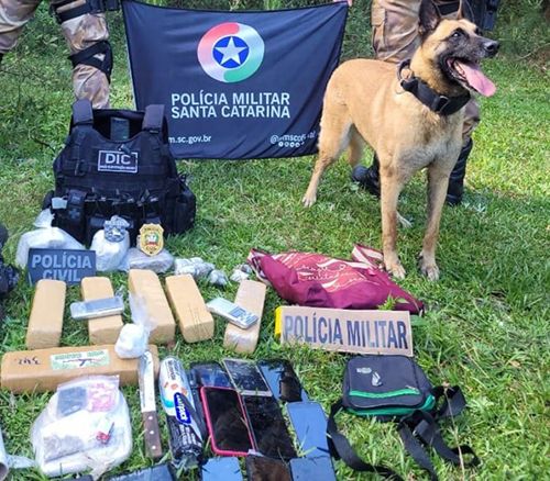 Durante a abordagem e com a ajuda do cão policial, as drogas foram encontradas em um matagal. Foram apreendidos cerca de 4,6 kg de maconha, 95 gramas de cocaína, 17 comprimidos de ecstasy e 14 aparelhos celulares.