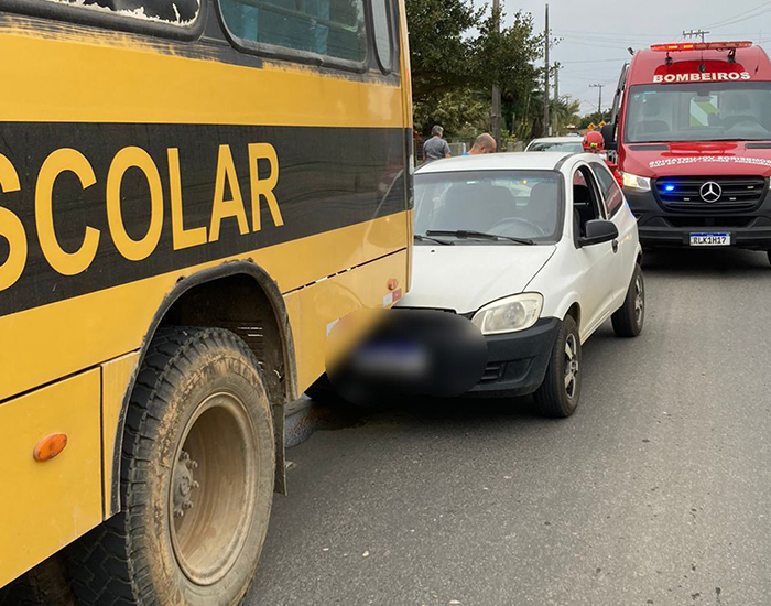 Um acidente envolvendo um ônibus escolar e um Celta foi registrado na tarde desta terça-feira, em Jaguaruna. A colisão traseira foi na SC-100, por volta das 12h30.