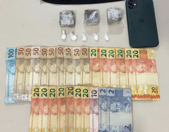Foram encontrados um tablete de maconha com 25,4g, R$ 824 em dinheiro e um celular. Em buscas na rodovia, os policiais localizaram mais dois tabletes de maconha e cinco porções de cocaína.