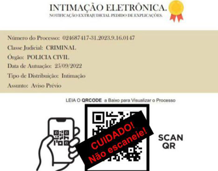 A intimação fraudulenta, que é assinada pelo inexistente Tribunal Eletrônico, contém erros de digitação e induz as vítimas a acessarem links maliciosos. A principal dica é não clicar em links ou códigos QR suspeitos. Em caso de dúvida, entre em contato com a suposta fonte por meio de outro canal ou pelo 181 da Polícia Civil