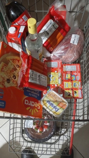 Na sacola, havia diversos tipos de gêneros alimentícios, como carne, bolachas, pizzas, manteiga, além de uma caixa de cerveja em lata e um litro de aguardente.