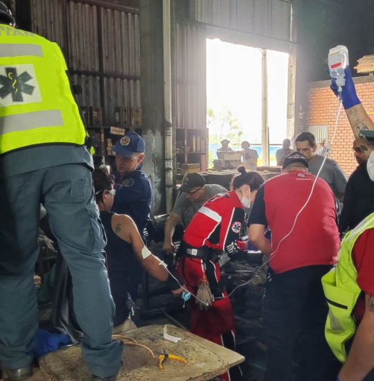 Com o uso de máquinas de corte, foram feitas pequenas aberturas na estrutura da máquina até ser possível ver as condições da mão e liberar a vítima.