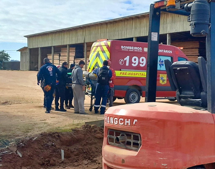 Um trabalhador de 58 anos foi socorrido, ontem pela manhã, após cair de uma altura de aproximadamente seis metros em uma madeireira localizada às margens da BR-101, no bairro Morro Azul, em Jaguaruna.