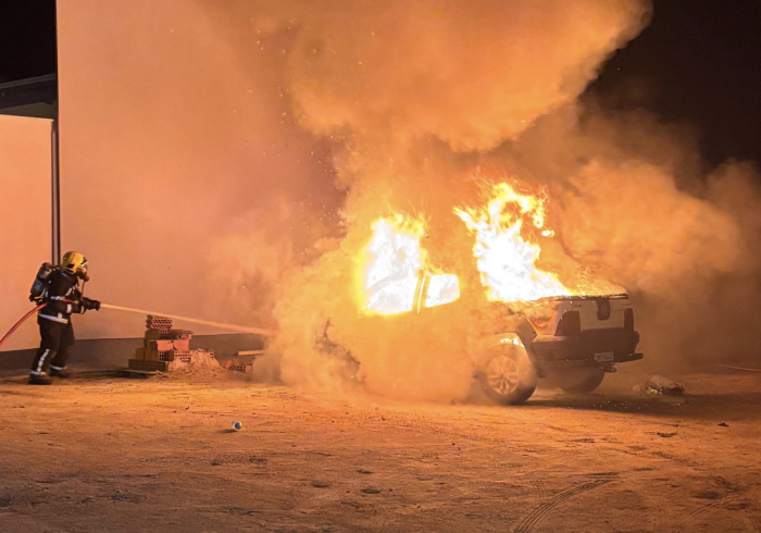 De acordo com os bombeiros, o fogo atingiu um veículo Fiat Strada, de cor branca, que estava estacionado no pátio de uma igreja.
