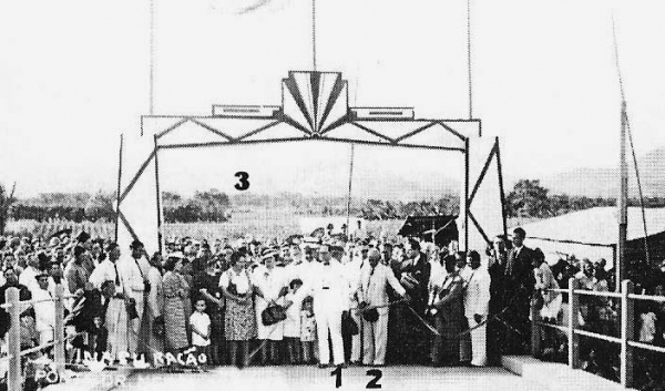 Inauguração da Ponte Nereu Ramos (1939). No centro, de terno branco, o próprio Nereu Ramos e, à sua esquerda, o prefeito Marcolino Martins Cabral.